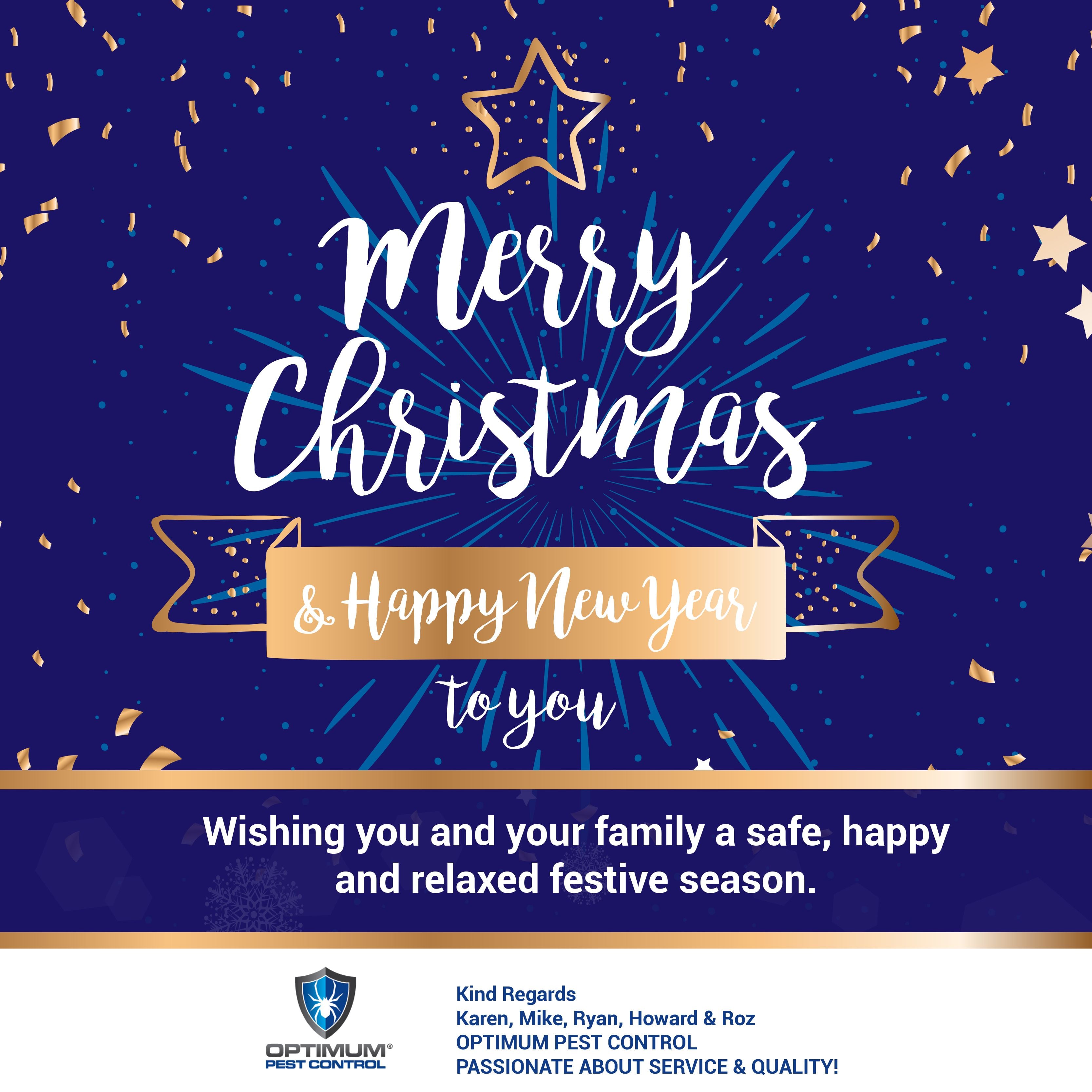 Wishing you and your family a safe, happy and relaxed festive season from the team at Optimum Pest Control. Karen, Mike, Ryan, Howard & Roz OPTIMUM PEST CONTROL PASSIONATE ABOUT SERVICE & QUALITY!