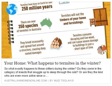 We keep harping on about TERMITES - but with the annual termite damage bill over $1billion in Australia - and properties losing significant value (and even losing a sale) due to termite infestation - why wouldn't you get your property checked out thoroughly on an annual basis - for a small fee? http://www.optimumpest.com.au/termites.html 28 August 2015
